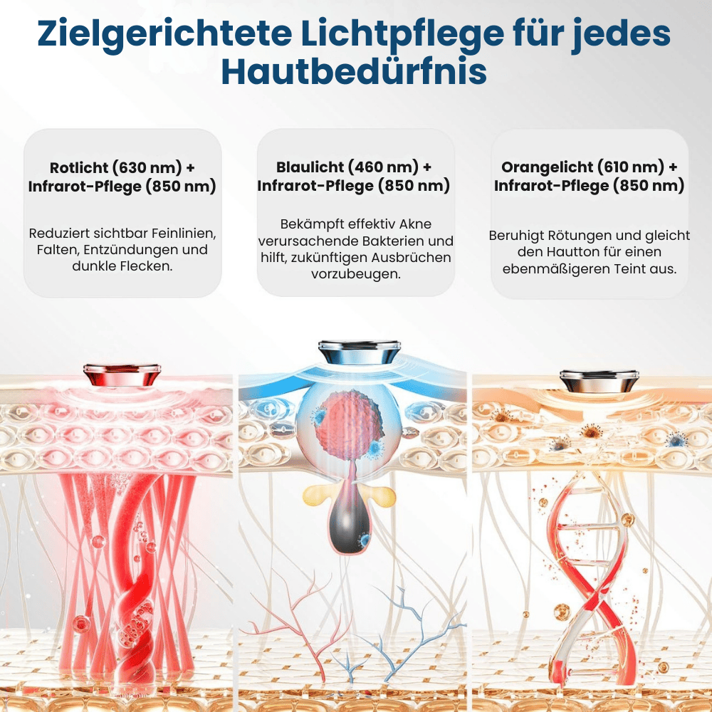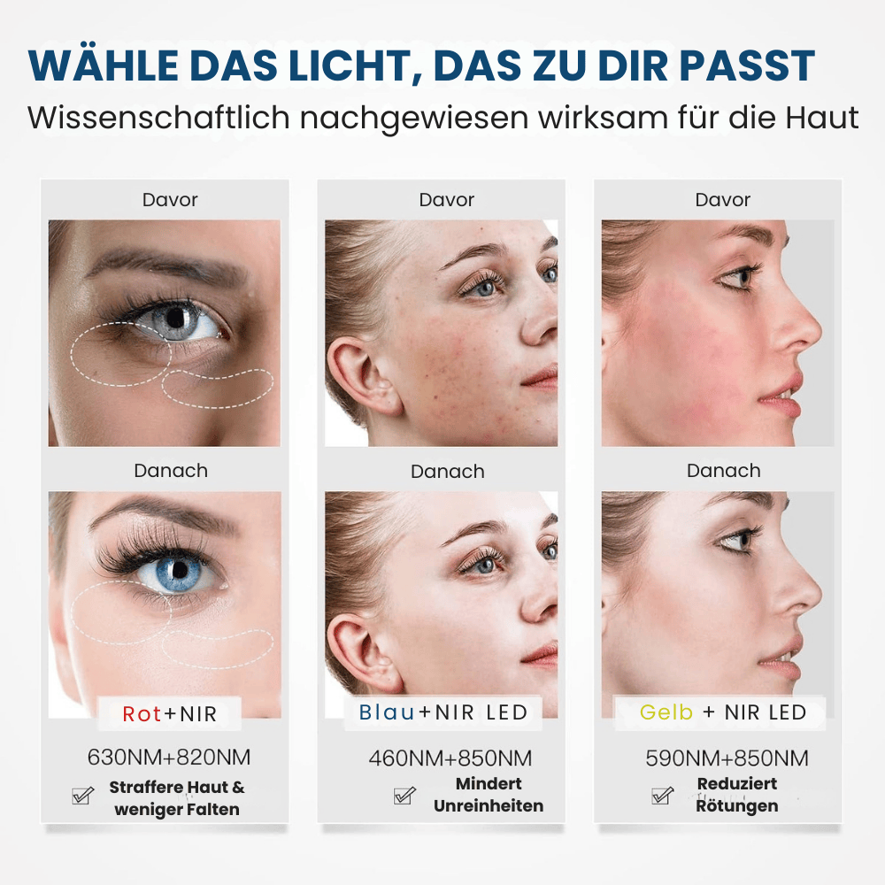 - Gelbes Licht (590 nm) – Hellt den Teint auf, mindert Müdigkeit & Mattheit